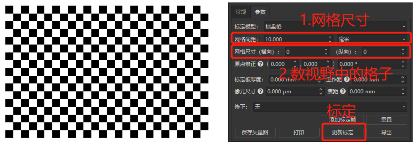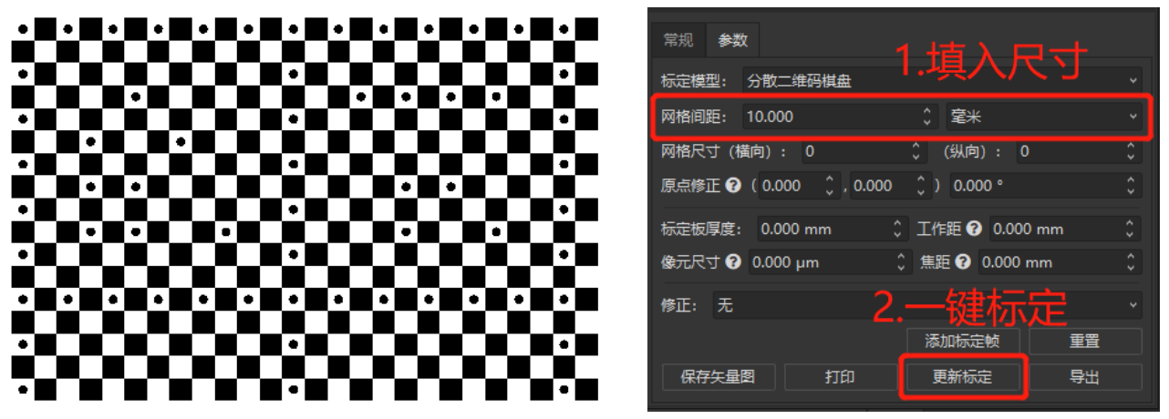 通過市場需求的調(diào)研,我們發(fā)現(xiàn)圖1中傳統(tǒng)棋盤格標(biāo)定的流程比較復(fù)雜,用戶除了需要知道網(wǎng)格的尺寸以外,還要通過數(shù)的方式確定在相機視野中的網(wǎng)格數(shù)量來完成標(biāo)定,如果實際應(yīng)用場景中網(wǎng)格間距尺寸比較小,用戶很可能數(shù)錯導(dǎo)致最后標(biāo)定失敗。