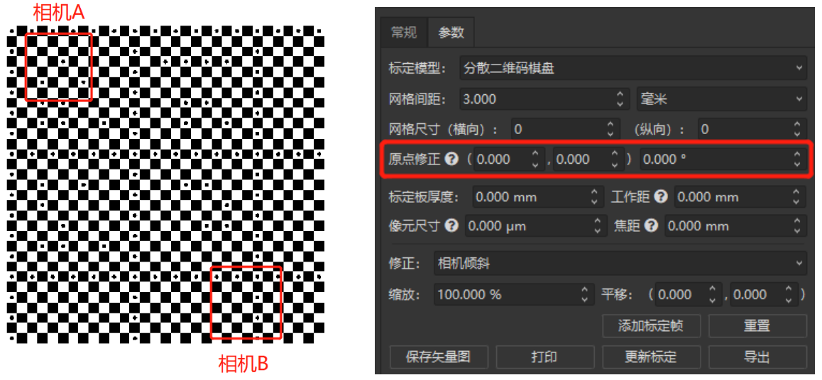 如上圖所示,用戶通過輸入網(wǎng)格間距、尺寸、原點修正等信息,可以將多個相機標(biāo)定在同一坐標(biāo)系內(nèi),實現(xiàn)多個相機的聯(lián)合標(biāo)定,從而計算出兩個相機內(nèi)任意兩點或者其他特征的距離。