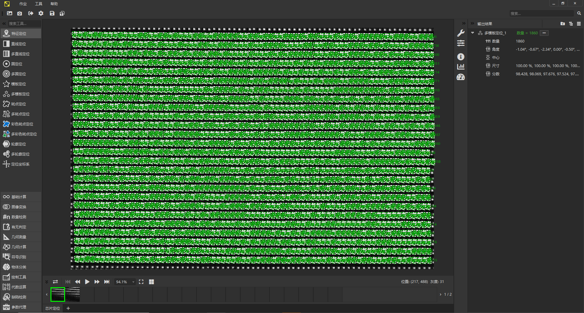 靈閃應(yīng)用結(jié)果:重復(fù)測量誤差最大0.08個(gè)像素,均值0.0197個(gè)像素,同時(shí)對近2000顆芯片進(jìn)行定位,耗時(shí)100ms